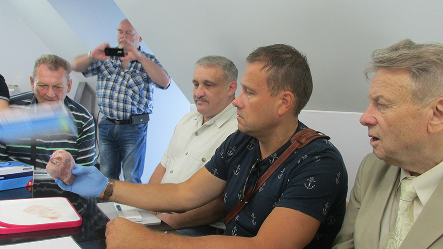 Затем нас разделили на команды и каждой выдали истекающее кровью "живое" сердце забитого кабана со множеством ран. "Патологоанатомические эксперты" наших команд должны были определить способы и орудия нанесения ранений. Надев резиновые перчатки, "эксперты" стали тщательно изучать поврежденную поверхность - прощупывать, замерять, зондировать, "обнюхивать" каждый сантиметр. И совершенно точно сделали свои заключения, указав на орудия убийства, висевшие на стенде.