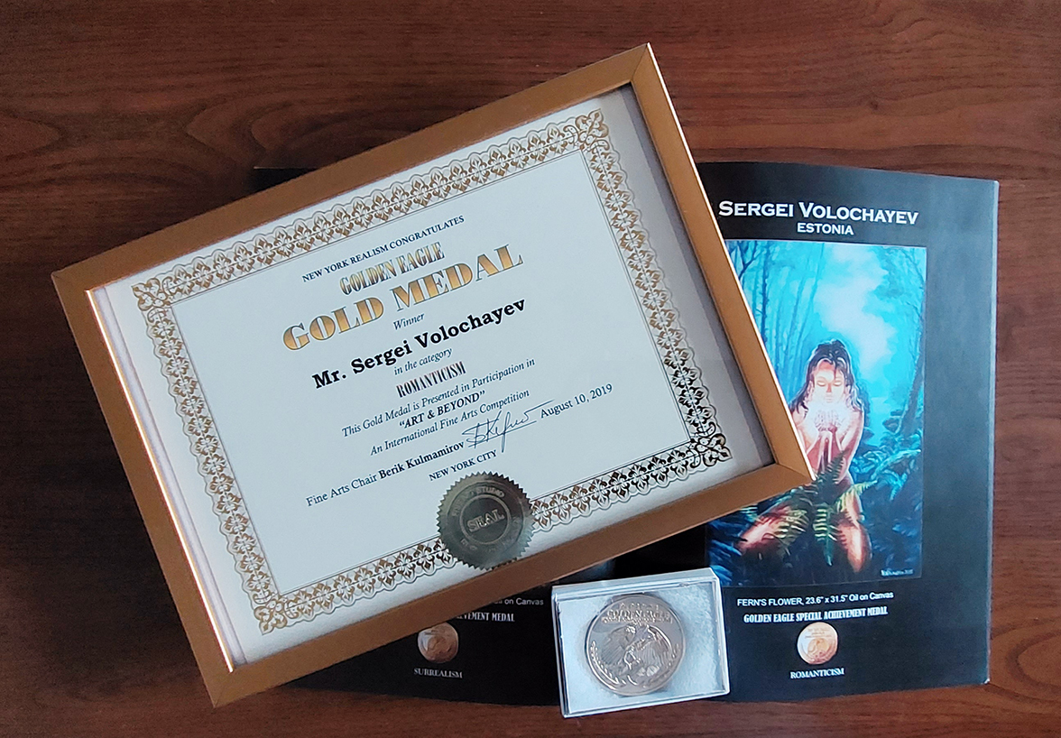 За картину "Цветок папоротника" удостоен медали "Золотой Орёл" на конкурсе "Современного реализма" в разделе "Романтика" в Нью-Йорке в 2019 году.